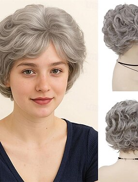 シニア女性向け合成ショートグレーカーリーウィッグ、シルバーグレーヘア、レイヤードピクシーカットヘアウィッグ、前髪付き、ふわふわウェーブウィッグ、おばあちゃん、デイリー、ハロウィン、コスチュームパーティー