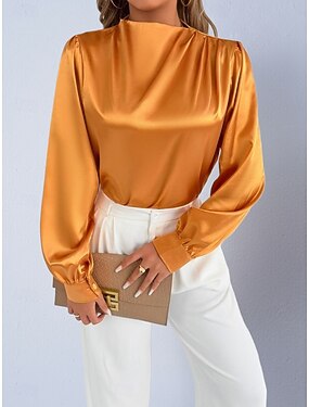 女性用 シャツ サテンシャツ カジュアルシャツ フリル 平織り スタイリッシュ ベーシック クラシック 長袖 ハイネック レギュラートップス 日常 祝日 お出かけ ブラック ホワイト ワイン ルビーレッド オレンジ 春 秋