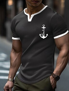 メンズ ファミリー アンカー マリン グラフィック Tシャツ ヘンリーネック Vネック スリムフィット マッスルフィット テクスチャードワッフル生地 夏 ビーチ クルーズ バケーション デザイナー衣料 アパレル S M L XL XXL XXXL