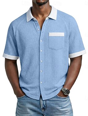 男性用 シャツ カジュアルシャツ ワッフルニットシャツ ブラック ホワイト バーガンディー ダークグリーン カーキ色 半袖 平織り シャツカラー カジュアル 日常 ボタン 衣類 エレガント ファッション カジュアル