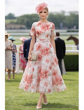 Aライン セミロング丈 カクテルドレス ウェディングゲストドレス エレガント 半袖 ボートネック ガーデンパーティー フォーマル ジャカード とともに フラワープリント プリント