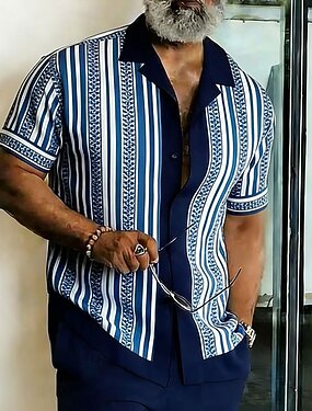 男性用 幾何学模様 ストライプ シャツ ボタンアップシャツ キャンプシャツ 半袖 ビジネスカジュアル ストリートウェア バケーション 夏 春 キューバンカラー 3Dプリント ブルー ワイン パープル グリーン