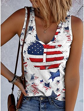 アメリカ独立記念日 女性用 タンクトップ プリント グラフィック フラッグ アメリカの国旗 ヴィンテージ トロピカル風 スタイリッシュ ノースリーブ Vネック レギュラートップス 日常 ブルー ホワイト ルビーレッド ネイビーブルー 夏 春