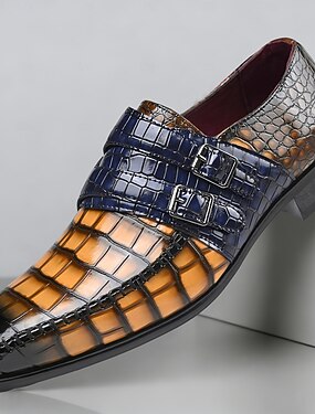 メンズ ブラウン ブルー クロコ型押し モンクストラップ ドレスシューズ ポインテッドトゥ フォーマルシューズ 結婚式、宴会、パーティー、プロム、オフィス、大胆な紳士のイブニングスタイルに最適