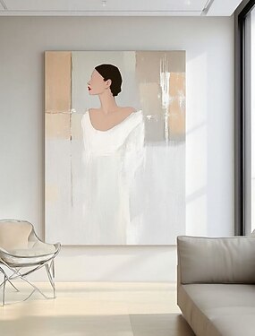 手作りの大きな抽象的な女性のキャンバスの油絵、女の子のダンサーの絵画、白いアートの絵画、手作りのアートのベージュのテクスチャの絵画、白いドレスを着たエレガントな女の子の絵画、人々の絵画、壁のアートの写真
