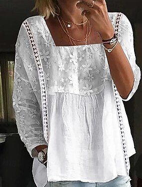 女性用 ブラウス フェイクコットンリネン 刺繍 フラワー スタイリッシュ カジュアル 七分袖 Vネック レギュラートップス 日常 ホワイト ピンク グリーン 夏 春