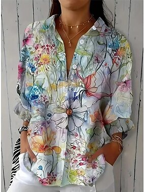 女性用 シャツ ボタン プリント フラワー スタイリッシュ カジュアル 長袖 シャツカラー レギュラートップス 日常 ホワイト ピンク 春 秋 冬