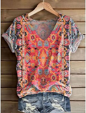 女性用 Tシャツ プリント フラワー グラフィック 幾何学模様 ヴィンテージ スタイリッシュ クラシック 半袖 Vネック レギュラートップス 日常 週末 グレー パープル オレンジ 夏 春