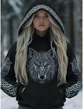 女性用 プルオーバー フーディー スウェットシャツ パッチワーク プリント フロントポケット グラフィック 動物 ヴィンテージ カジュアル ボヘミアン 長袖 フード付き レギュラートップス カジュアル ストリート 日常着 ブラック 冬