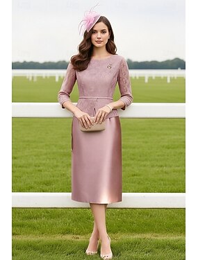 シースカラムティー・レングス・パーティードレス カクテルドレス ウェディングゲストドレス 花嫁の母ドレス 3/4レングススリーブ クルーネック エレガント フォーマル レース付き