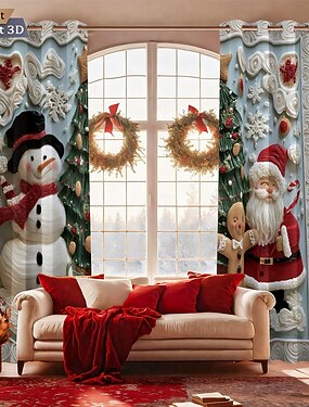 クリスマス、サンタクロース、雪だるまの断熱カーテン、2点セット、グロメット付き遮光窓用ドレープ、屋外バルコニー、リビングルーム、ホリデーホームデコレーション用