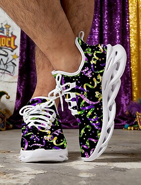 男性用マルディグラコンフェッティプリントレースアップスニーカー - クッション性のある快適なフェスティブシューズ、カーニバルパレード、ストリートのお祝い、テーマパーティー カジュアルホリデーアウトングに最適