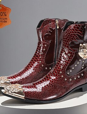 メンズ バーガンディ本革スネークプリント アンクルブーツ(メタルバックル付き) - ゴシックパンク パーティーシューズ