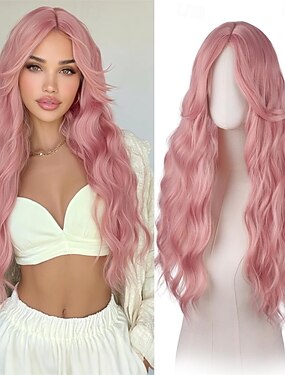 女性用ロングピンクウェーブウィッグ、センターパート、26インチ、ライトピンクのカーリーウェーブウィッグ、自然な見た目の耐熱合成繊維ウィッグ、日常使いやパーティーに最適