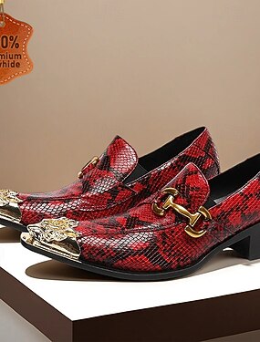 ゴールドのアクセントが付いたメンズの赤い蛇柄ローファー。スタイリッシュなスリッポンデザインで、クリスマスのお祝いや新年のお祝いなど、クリスマスの装飾にぴったりです。
