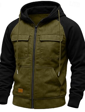 男性用 フルジップパーカー ジップアップフーディー ブラック アーミーグリーン フード付き カラーブロック ジッパーを閉める パッチワーク スポーツ 日常 祝日 ポリエステル ストリートファッション ベーシック カジュアル 春 & 秋 衣類 パーカー トレーナー 長袖