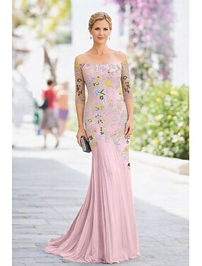 トランペット/マーメイド フロア丈 二次会ドレス / カクテルドレス ウェディングゲストドレス マダムドS ハーフスリーブ オフショルダー エレガント シンプル カジュアル フォーマル シフォン レース 〜と プリーツ 刺繍 アップリケ