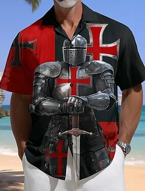 男性用 十字軍 鎧 十字架 シャツ キューバシャツ ボタンアップシャツ 半袖 ヴィンテージレトロ ストリートウェア 祝日 夏 春 キャンプカラーシャツ 3Dプリント ブラック