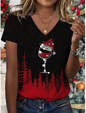 クリスマス 女性用 Tシャツ グラフィック サンタクロース ヴィンテージ スタイリッシュ クラシック 半袖 Vネック レギュラートップス 日常 プリント ブラック ホワイト ルビーレッド グリーン 夏 春 秋 冬