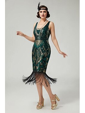 20代の轟音 1920年代風 膝丈 フラップワンピース ノー・スリーブ グレートギャツビー スパンコール フリンジ Vネック 仮装 女性用 クリスマス カーニバル マスカレード レトロテーマパーティー チャールストンダンス 成人 ドレス