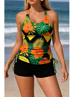 女性用 スイムウェア タンキニ 2ピース ハイウエスト 水着 おなかコントロール ハイウエスト スリム バックレス 旅行度假风 ビーチウェア フラワー Uネック ノースリーブ 水着