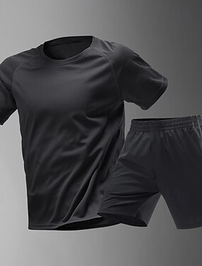男性用 ソリッド ワークアウトスーツ 2ピーススポーツセット 夏 半袖 速乾性 ビデオ圧縮 吸汗性 ジムトレーニング アクティブトレーニング 運動 ダークグレー ブラック Black+Grey スポーツウェア アクティブウェア