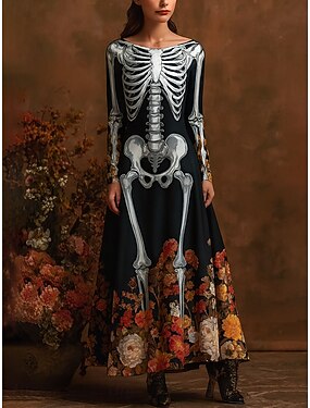ウィメンズスケルトン マキシドレス シースドレス Aラインドレス カジュアル ボヘ ウェディングゲスト ビーチ レギュラーフィット フローラル グラフィック ロングスリーブ クルーネック ボートネック ブルー パープル オレンジ グリーン 春 秋 冬
