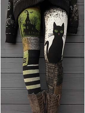 ウィメンズ レギンス バケーション ヴィンテージ エスニックスタイル フルレングス ハイウエスト グラフィック アニマル キャット 3Dプリント 速乾 通気性 ソフト ストレッチ フォーマル アウトドア バケーション ダークグレー オレンジ グリーン 秋 レギュラーフィット