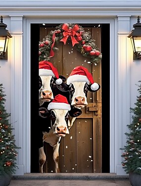 クリスマスのドア飾り、牛のドアカバー、ドアのタペストリー、ドアカーテンの装飾、クリスマスの背景、玄関ドア用ドアバナー、ホリデーパーティーの装飾用品