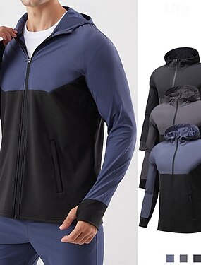 男性用 カラーブロック スポーツジャケット 秋冬 フード付き 長袖 アスレイジャー 日焼け防止 ライトウェイト ジム ハイキング ランニング いい結果になる ヨガ ブラック ブルー ダークブルー スポーツウェア アクティブウェア