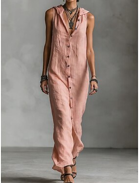 レディース マキシ丈 フェイクコットンリネンドレス シフトドレス サマードレス カジュアル デイリー ゆったりフィット 無地 ノースリーブ フード付き ネイビー ブラック ピンク ブラウン 夏