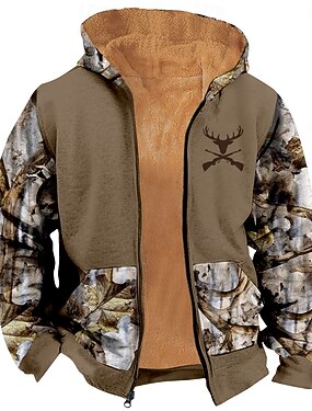 男性用 カモフラージュ フリース パーカー ジャケット スウェットシャツ ファッション クール 日常 ヴィンテージレトロ フード付き アウトドア ハンティング ブラウン カーキ色 アーミーグリーン ジッパー ポケット 秋 冬 デザイナー S M L XL XXL XXXL
