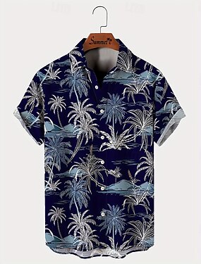 男性用 ココナッツの木 熱帯植物 カジュアルシャツ アロハシャツ ボタンアップシャツ 半袖 ハワイアン リゾート バケーション 祝日 ビーチウェア 夏 春 折襟 3Dプリント 襟付きシャツ ダークブルー