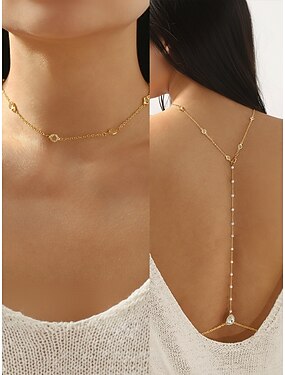 女性用合金ティアドロップペンダントボディチェーン、ゴールドシルバーバックネックレスジュエリー、ビーチバケーション、パーティーイブニングウェア、背中の開いたドレス、リゾートスタイルに最適
