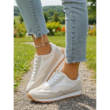 レディース ベージュ レトロ スニーカー – ローカット レースアップ カジュアル ウォーキングシューズ。普段使い、カジュアル、ストリートウェアに最適。