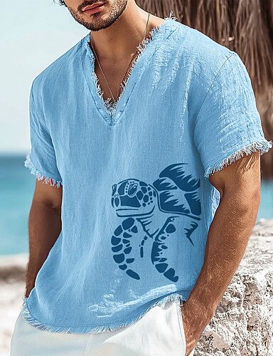 メンズ ウミガメ柄 リネンコットン混紡 Vネック Tシャツ 切りっぱなし サマー ビーチ バケーション コースタル Tシャツ ほつれ加工 ソフト ファッション トップ S-3XL