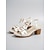パールのアンクルストラップと花柄のリボンが付いたレディースのホワイトブロックヒールサンダル。ガーデンウェディングや屋外でのセレモニーに最適なエレガントなウェディングゲストシューズです。