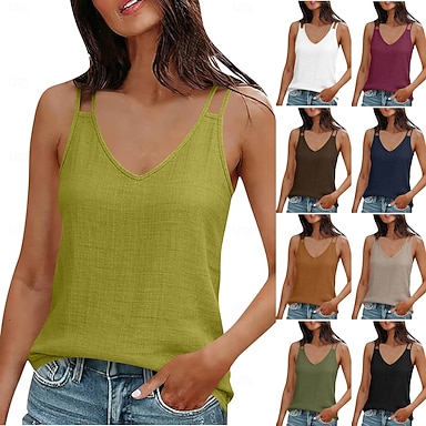 女性用 夏のトップス フェイクコットンリネン ドローストリング 純色 エレガント トロピカル風 日常 ノースリーブ ノー・スリーブ Vネック レギュラートップス 日常 ワーク 祝日 リーフグリーン ブラック ホワイト ライトグリーン ルビーレッド 夏 春 秋