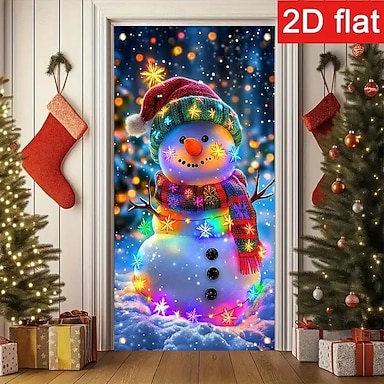 クリスマスドアカバー、光る雪だるまデザイン、冬テーマ、ホリデードレープ、お祝いの光の効果、家庭用リビングルーム寝室用装飾カーテン、クリスマスパーティーの出入り口の装飾