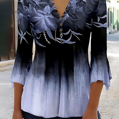 女性用Tシャツ Vネック オンブレ フローラル グラフィック エレガント 3/4丈袖 レギュラートップス デイリー 外出用 ボタン グラスグリーン ブラック&グレー ブルー パープル グリーン 夏 春 秋