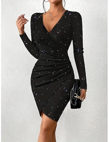 女性用 ミニドレス ラップドレス ボディコンドレス カクテル セミフォーマルドレス オフィス スリム 平織り 長袖 Vネック ブラック ルビーレッド ブルー グリーン 春 秋 冬