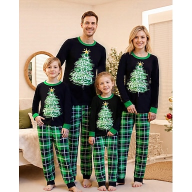 ファミリールック クリスマス クリスマスファミリーパジャマ パジャマ ファミリーセット グラフィック チェック クリスマスツリー 家 プリント グリーン 長袖 日常 マッチング衣装