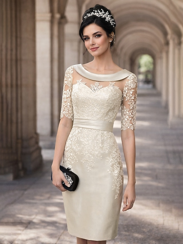 Sheath Column Knee Length Party Dress Cocktail Dress Wedding Guest Dress Mother of the Bride Dress Short Sleeve Jewel Neck Elegant Vintage Wedding Guest Satin Lace with Appliques