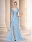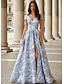 A-lijn Tot de grond Avondjurken Baljurk Formele kleding Elegant Bloemig Hoge splitsing Korte mouw V-hals Bruiloft Formeel Zak Jacquard Rugleuning met Bloemenprint Strik(ken) Zak