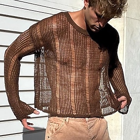 Voor heren Gebreid T-shirt T-shirt Lange mouw Strakke ronde hals Zomer Effen Kleur Dagelijks Casual Street Style Netstof Gebreid Casual Buiten Straat Donker Bruin Top T-shirt voor mannen