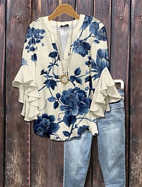 Dames T-shirt Ruche Afdrukken Bloemig Grafisch Modieus Modern Halve mouw V-hals Normale tops Dagelijks Uitgaan blauw Marine Blauw Stoffig blauw Zomer Lente