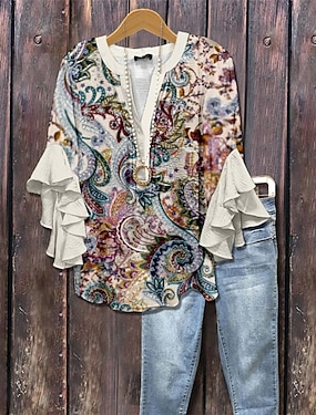 Dames T-shirt Ruche Afdrukken Bloemig Grafisch Modieus Modern Halve mouw V-hals Normale tops Dagelijks Uitgaan blauw Blozend Roze Bruin Zomer Lente
