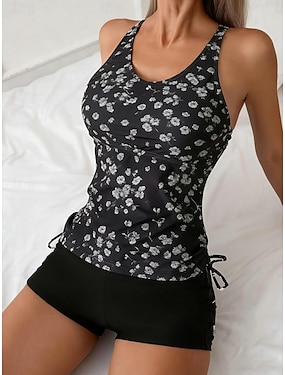 Dames Zwemkleding Tankini 2 stuks Korte broek Zwempak Buikcontrole Hoge taille Slank Blote rug Vakantie Strand Kleding Bloemig U-hals Mouwloos Badpakken