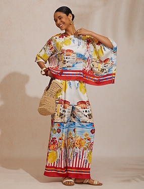 Mallorca Blossom zijdezachte satijnen broek met elastische taille en wijde pijpen