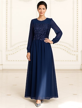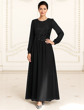 A-Lijn Vloerlengte Feestjurk Cocktails Jurk Bruiloft Gasten Jurk Moeder van de Bruid Jurk Lange Mouwen Crew Neck Elegante Formele Bruiloft Gasten met Borduursel